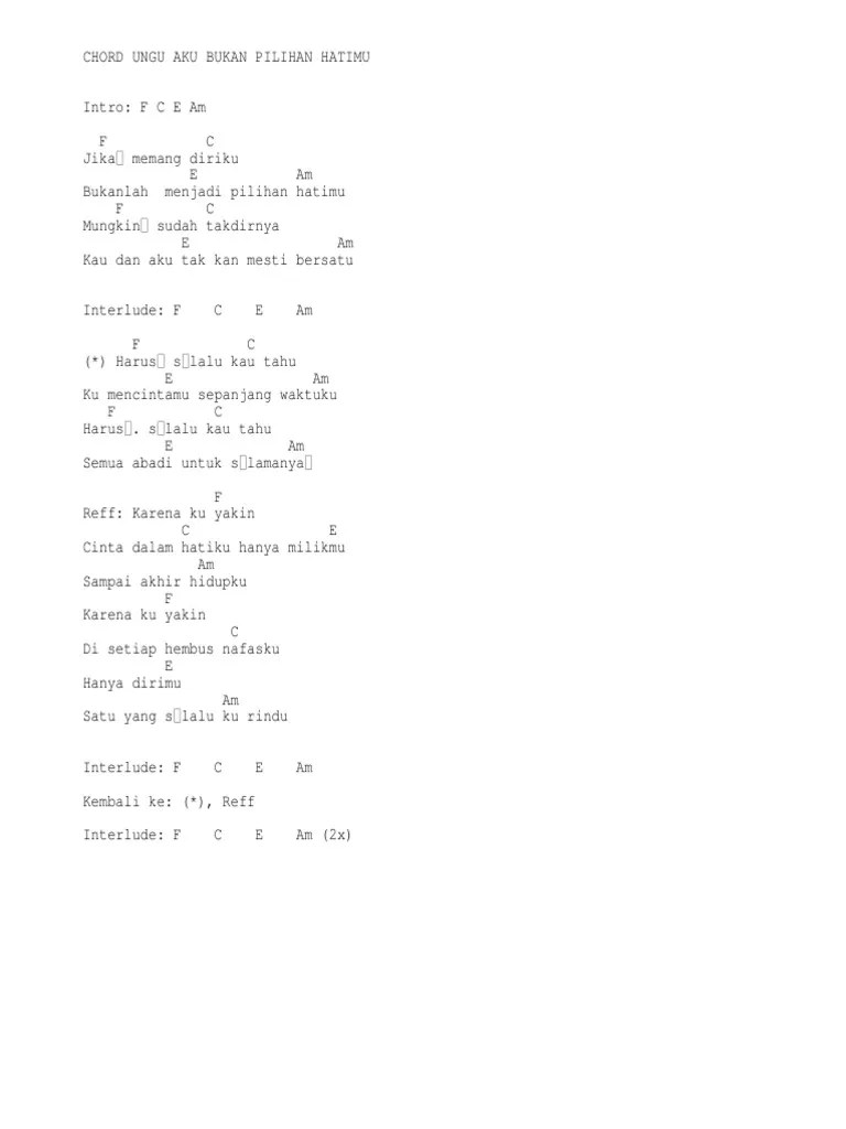 E am semua abadi untuk s'lamanya… f reff: F c karena ku yakin (yakin) di setiap hembus nafasku E am hanya milikmu sampai akhir hidupku. G b cinta dalam hatiku hanya milikmu Bo chord aku bukan pilihan hatimu | ungu c intro c g b em bait c g b. Karena ku yakin cinta dalam hatiku. Mungkin sudah takdirnya kau dan aku takkan mesti bersatu. Karena kuyakin cinta dalam hatiku Am semua abadi untuk slamanya chorus e c karena kuyakin cinta dalam hatiku e . Chord lagu termudah & terkeren. Karena ku yakin disetiap hembus nafasku. Aku bukan pilihan hatimu chords. Lirik dan chord ― aku bukan pilihan hatimu adalah lagu yang di bawakan oleh grup musik ungu.